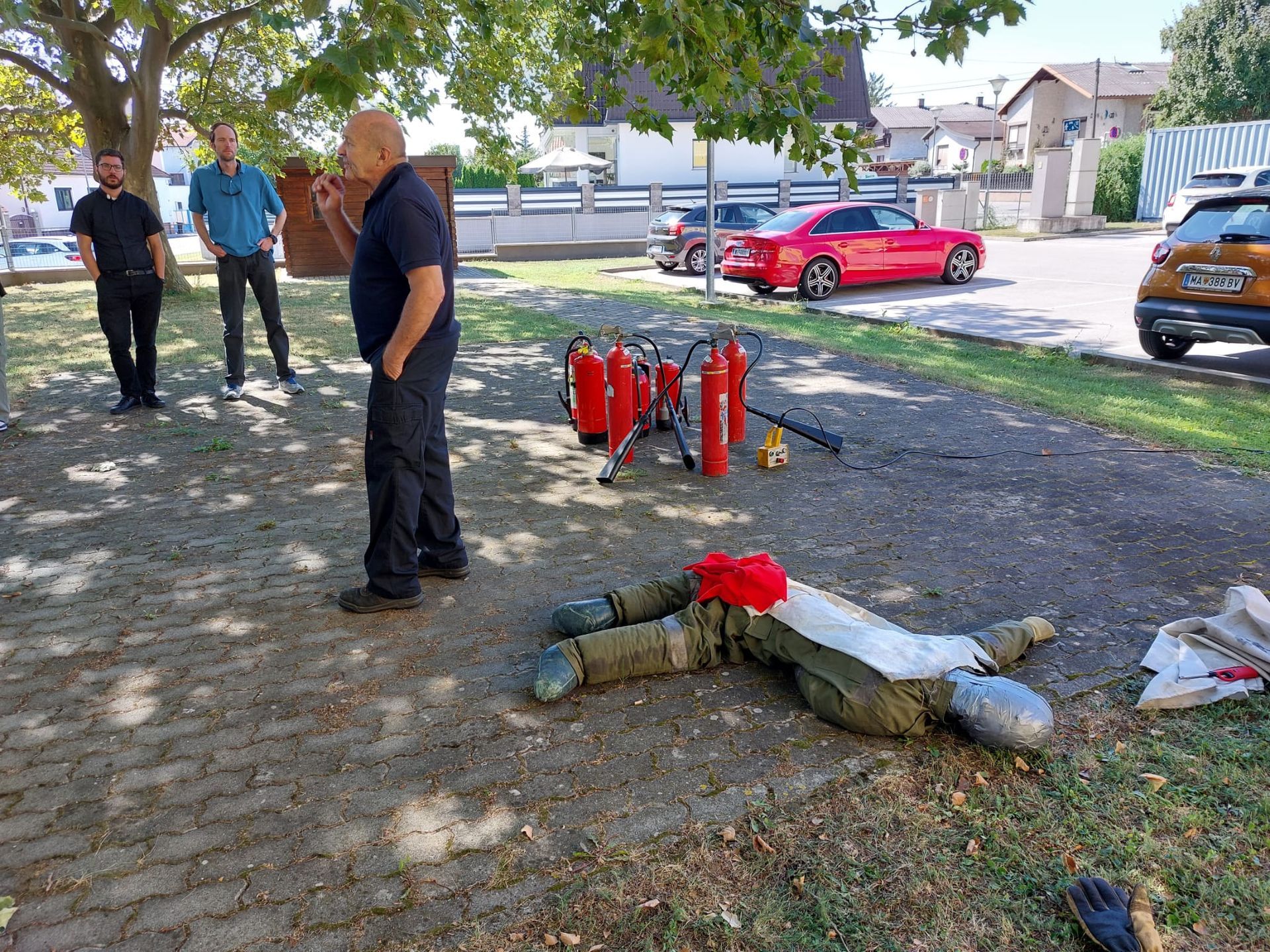 Das neue Team wird im Brandschutz eingewiesen, um auch im kommenden Schuljahr sicher unterwegs zu sein.
